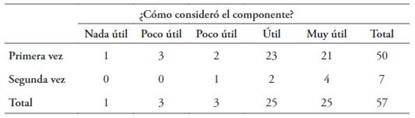 De acuerdo con la Tabla 1, el componente se consideró «Muy útil» y «Útil» (43,9%) en cada una de estas categorías, con porcentaje acumulado de 87,8%. Las actividades fueron consideradas «Interesantes» (47,4%) y «Muy interesantes» (45,6%) de los casos.