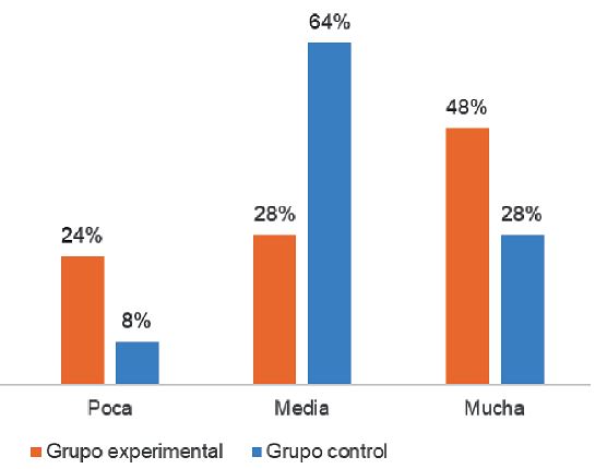 Al comparar la afinidad que percibieron entre los compañeros para el armado de grupos los alumnos que usaron la herramienta lúdica 48% respondieron que sintieron mucha afinidad entre ellos, un 28% con media afinidad y un 24% con poca afinidad. El grupo que no recibió la herramienta pedagógico-lúdica percibió solo en un 28% mucha afinidad, y la mayoría con un 64% percibieron media afinidad entre ellos.