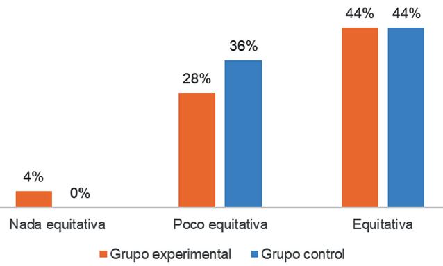 Al preguntar ¿cómo percibiste la distribución de las tareas a desarrollar?, los alumnos de ambos grupos respondieron con la cifra más alta de distribución equitativa con un 44% y solo un 4% consideró que la distribución de tareas a desarrollar había sido nada equitativa.