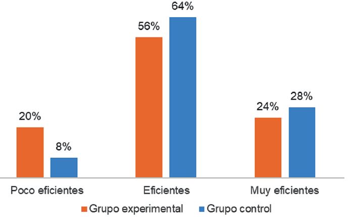 En cuanto a las reuniones grupales la cifra más significativa se encuentra cuando los alumnos del grupo experimental la calificaron como eficientes con un 56% y muy eficientes con un 24%. Se observa cómo los resultados del grupo control son superiores con un 64%, esto señala la necesidad de una mayor precisión en la formulación de la pregunta en relación con el juego.