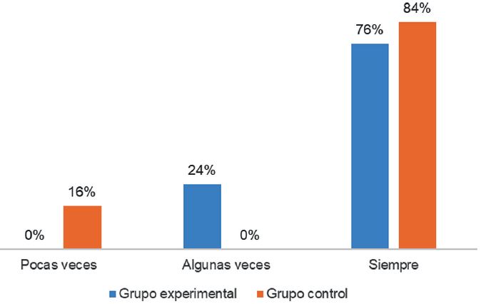 Al preguntar sobre posibles conflictos y conocer el comportamiento de los alumnos ante una situación problemática observamos -como se muestra en el gráfico- que el grupo control en su mayoría con un 44% no tuvo conflicto. Al compararla con el grupo experimental en el que un 24% dice no haber tenido conflicto puede apreciarse el reflejo de un incremento en el compromiso hacia el equipo y sus logros. La cifra más relevante muestra que en el grupo experimental todo conflicto se resolvió rápidamente con un 52% frente a un 40% del grupo control.
