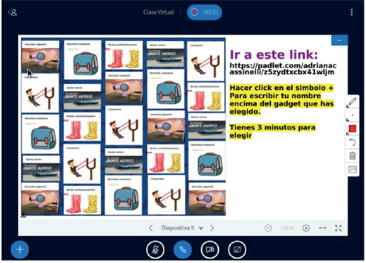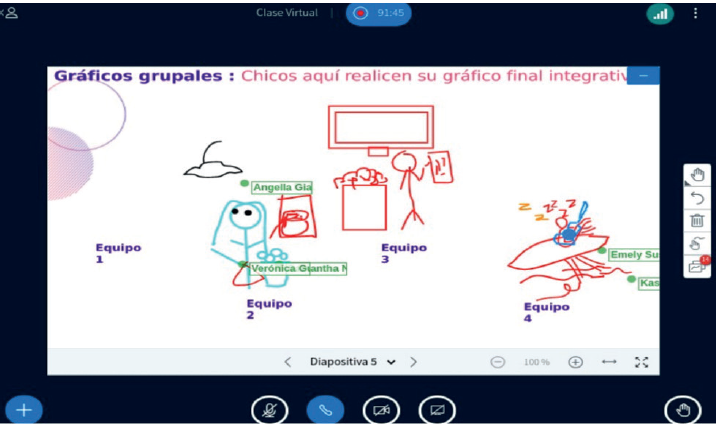 Para ambientar la mecánica de los juegos se presenta Konecta, el primero de los microjuegos, cuya misión consistió en ingresar al salón en la eventualidad de un error de limpieza puesto que se derramó aceite por equivocación, los estudiantes tuvieron que elegir un elemento para poder superar el corredor resbaladizo; de este modo y sin que lo supieran previamente, se crearon grupos de trabajo variados y por elección de un elemento común, como se puede ver en la Figura 1. El reto se planteó con los grupos conformados y consistió en una actividad en la que empatizaron a través de adivinar qué entretenimiento y comida favorita pertenecían a cada jugador quien lo había anotado en la pizarra de la video clase de forma anónima.