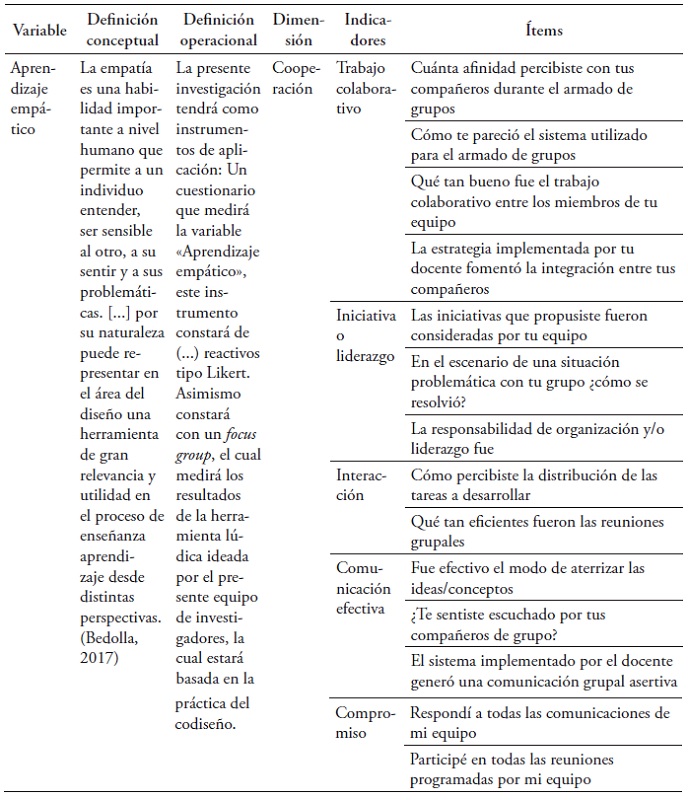 La herramienta lúdica DisKo, como herramienta que mide la variable dependiente aprendizaje empático, que se midió con el desarrollo y puesta a prueba de cinco microjuegos para fomentar la cooperación entre los estudiantes, dichos juegos compusieron la herramienta DisKo que se aplicó como variable independiente ya que se introducen elementos que causan efecto sobre la cooperación (fenómeno de estudio), como puede observarse en la operacionalización de la variable.