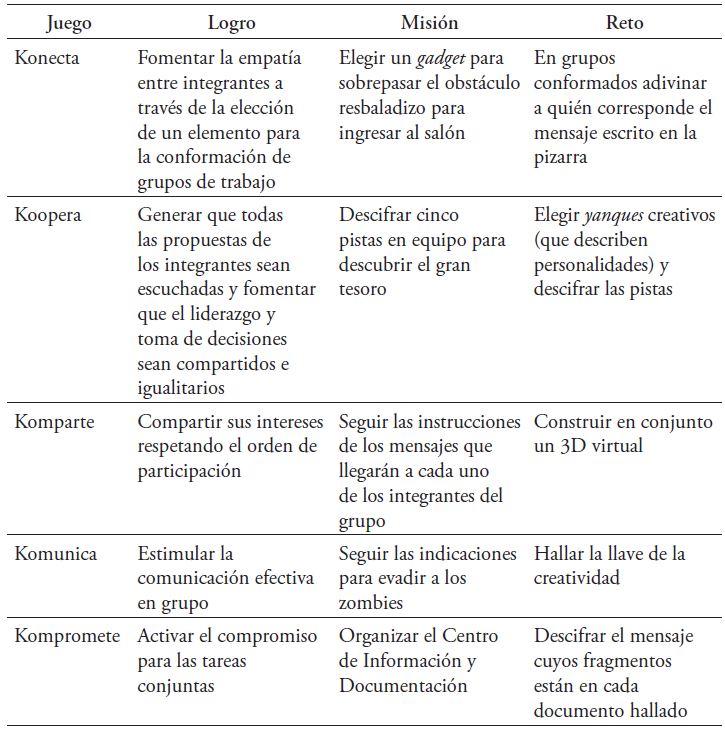 Para cada uno de los indicadores se diseñó un microjuego: (a) Konecta, (b) Koopera, (c) Komparte, (d) Komunica y (e) Kompromete.