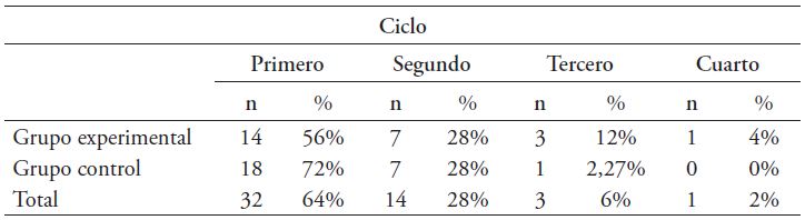 En la Tabla 2 se evidencian los resultados del análisis descriptivo respecto al ciclo en el que se inscribieron los estudiantes.