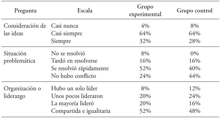 El segundo de los indicadores se enfocó en detectar si las iniciativas propuestas por cada integrante del equipo fueron consideradas por su equipo, otro de los criterios apuntó a la resolución de conflictos y por último se indagó sobre si se compartió o no la responsabilidad de organización o liderazgo. Los resultados se presentan a continuación.