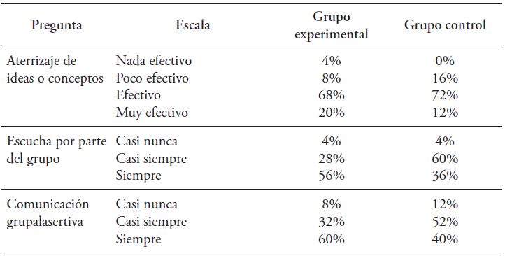 El tercero de los indicadores determinó la comunicación efectiva, permitiendo consultar qué tan eficaz fue el modo de aterrizar las ideas o conceptos, qué tan escuchados se sintieron por sus compañeros de grupo y si el sistema implementado por el docente generó una comunicación asertiva.