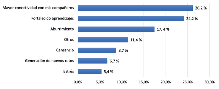 En referencia al párrafo anterior, la Figura 2 evidencia que el 24,2% del estudiantado durante las horas que habitualmente participan en equipos durante las clases en línea aun con las cámaras apagadas han fortalecido sus aprendizajes, sin presentar problemas de conectividad un 26,2%, no obstante, un 17,4% presenta una sensación de aburrimiento, el 8,7% algún tipo de cansancio, además que el 5,4% estrés y nerviosismo.