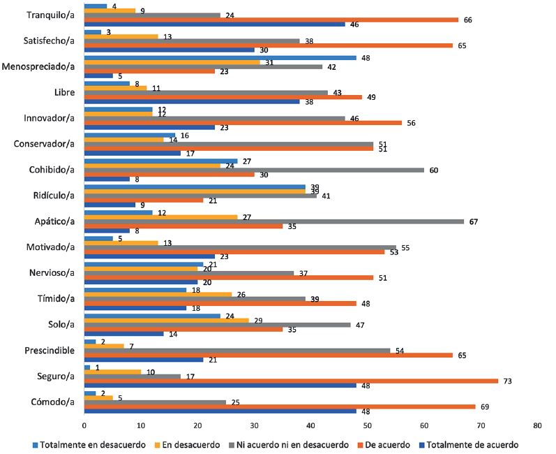 Las emociones experimentadas por las personas estudiantes evidencian que existe un mayor número de sensaciones de acuerdo que en desacuerdo entre estas: el sentirse cómodo, seguros, innovadores, prescindibles, satisfechos y tranquilos son aspectos destacables en este punto, sin embargo, existen experiencias que resultan interesantes de monitorear como el nerviosismo, la motivación, la libertad, lo cohibido, lo conservador y lo menospreciado todas en un rango que van ni acuerdo ni en desacuerdo.