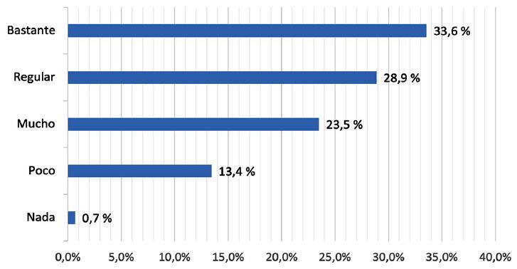 Por otro lado, el 38,9% del estudiantado indica aprovechar bastante las interacciones desde las clases sincrónicas, un 34,9% regular, 16,1% mucho, 10,7% poco y el 0,7% nada. En términos de metodología el 46,3% valora bien la que se utiliza en las videoconferencias y un 33,6% de forma regular, el 18,8% muy bien, 2,7% mal y 0,7% muy mal.