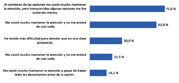 Finalmente, en términos del cuarto bloque de preguntas, que hace referencia a mantener la atención durante las sesiones de videoconferencia a lo que la Figura 5 representa las frases del comportamiento durante las sesiones asincrónicas, resaltando que un 71,8% señala que al comienzo de las sesiones les costaba mucho mantener la atención, pero transcurridas algunas sesiones les fue costando menos.