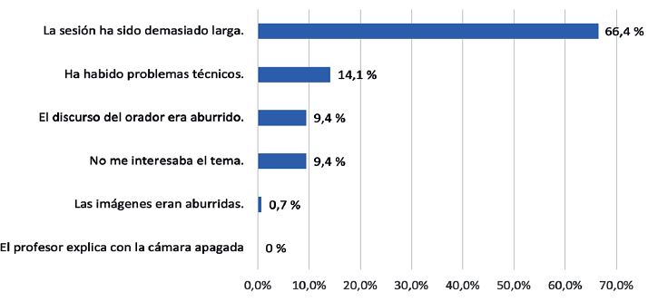 Por otro lado, la Figura 6 muestra la motivos del por qué el estudiantado presenta dificultades para mantener la atención en donde el 66,4% menciona que la razón principal es cuando las sesiones han sido demasiado largas, un 14,1% cuando se han presentado problemas técnicos, asimismo, el 9,4% tiene que ver en dos vías una porque el discurso del orador es aburrido y la otra porque no les interesa el tema, sumado al 0,7% que manifiesta cuando las imágenes son aburridas y no permite una buena interacción y dinámica en las sesiones.