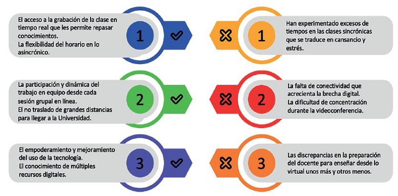 Se considera esencial aclarar que, aunque los participantes evidenciaron que hay factores que repercuten en el éxito de la videoconferencia durante las clases virtuales, estos mismos, podrían ser detonantes de una mala experiencia en la práctica educativa virtual, por lo tanto, es un proceso de constante mejora que no solo le compete al estudiante, sino al docente, donde la institución universitaria adquiere un papel protagónico de seguimiento y control. Asimismo, se considera importante mencionar que existe una vertiente literaria donde los autores hacen una clara distinción del reto de la enseñanza-aprendizaje en línea.