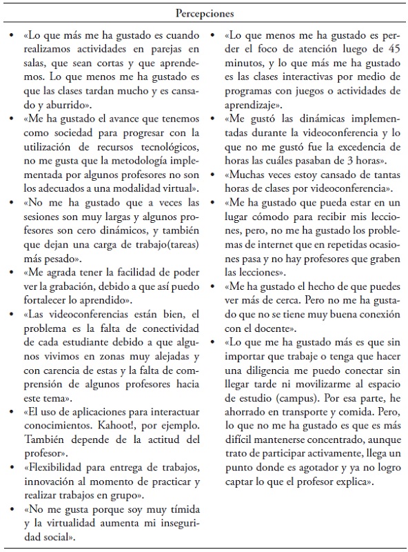 Perceptions by students in the use of videoconferencing during virtual classes at the university level in times of COVID-19