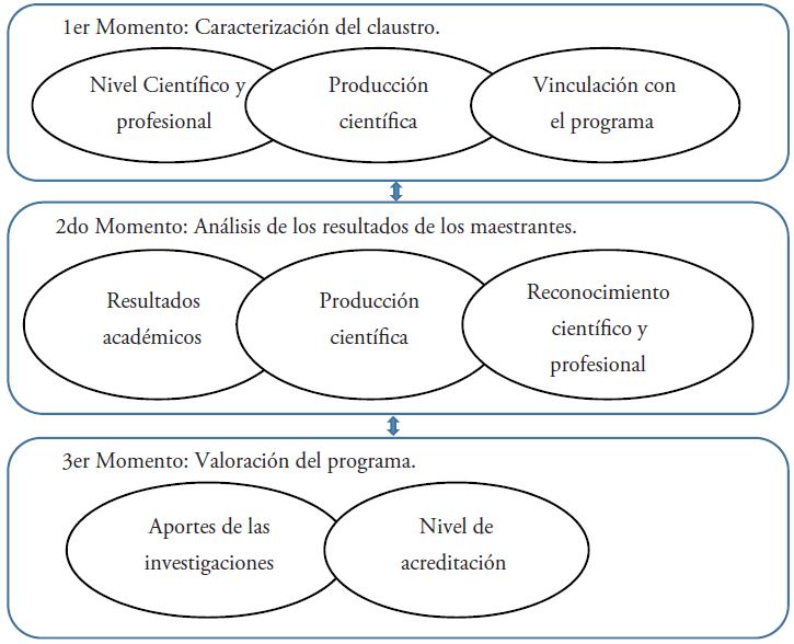 La metodología elaborada, ver Figura 1, se dirige a evaluar el impacto de la maestría en Educación Matemática Universitaria de la Universidad de Holguín, la cual consta de tres momentos fundamentales: caracterización del claustro, análisis de los resultados de los maestrantes y valoración del programa. Para el primer momento se tienen en cuenta los indicadores: nivel científico y profesional, la producción científica y la vinculación con el desarrollo del programa; para el segundo momento se consideran los resultados académicos, la producción científica y el reconocimiento científico y profesional. El último momento se concentra en los aportes de las investigaciones y nivel de acreditación.