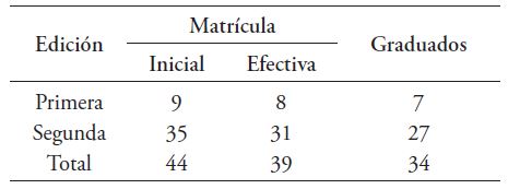 En la Tabla 4 se presentan los resultados relacionados con los indicadores de eficiencia del programa, en este caso, la cantidad de maestrantes graduados de acuerdo a la matrícula de cada una de las ediciones concluidas.