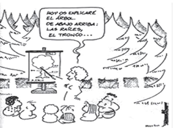 En síntesis, se evidencia un énfasis puesto en la acción de los estudiantes para aprender y en el rol del docente como el que posee el conocimiento y busca las herramientas para que aprendan los estudiantes. Pero, no aparece una mirada a la interacción entre lo que hace el sujeto que aprende, lo que hace el sujeto que enseña y el conocimiento. Aparecen estos tres elementos del proceso educativo como estáticos e independientes uno del otro.