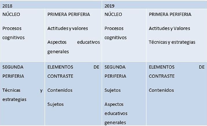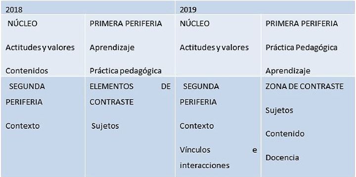 Al comparar las estructuras identificadas se puede afirmar que se trata de dos RS diferentes ya que, aunque para ambos grupos se encuentra en el núcleo la categoría «actitudes y valores» -con una significación puesta en lo vocacional del ser docente en relación con la paciencia, el amor, la perseverancia-, la categoría contenidos solo aparece en la RS del grupo de la cohorte 2018. Además, esta categoría («contenidos») para la cohorte 2019 se ubica en la zona de contraste, es decir, no forma parte de la RS que predomina en el grupo.