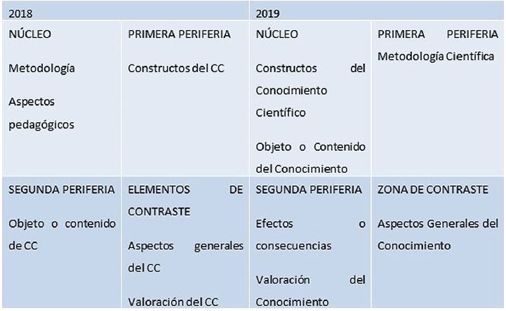 En relación con el conocimiento científico claramente se han identificado dos RS diferentes, mientras que para el grupo de la cohorte 2018 la centralidad está puesta en aspectos metodológicos (investigar, experimentación, método científico, etc.) y pedagógicos -vinculados con la idea de «ciencia escolar»- (escuela, aprendizaje, métodos de estudio, etc.), para la cohorte 2019 en el núcleo se ubican aspectos relacionados con la estructura de la ciencia (teorías, leyes, principios, hipótesis, etc.) y el contenido u objeto de estudio del conocimiento científico (conceptos, conocimientos específicos, Física, Química, etc.). La principal diferencia que se puede destacar es que mientras que para el primer grupo hay elementos tanto relacionados con aspectos epistemológicos como pedagógicos, para el segundo grupo solo se observan categorías vinculadas con los aspectos epistemológicos.