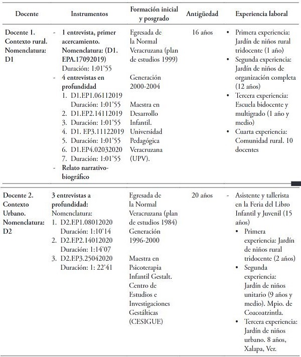 Las educadoras1 que participan en este estudio laboran en instituciones educativas del nivel preescolar pertenecientes al sector público y de sostenimiento estatal2. La docente 1 (D1) se desempeña en un contexto rural de fácil acceso en transporte particular, aproximadamente a cuarenta minutos de Xalapa, capital del estado de Veracruz. Su centro de trabajo es un jardín de niños3 de organización completa que durante el ciclo escolar 2020-2021 atendió a cinco grupos: uno de primer grado, dos de segundo y dos de tercero. La docente 2 (D2) realiza sus intervenciones en un jardín de niños urbano de organización completa y sostenimiento estatal, ubicado en una zona céntrica de la ciudad de Xalapa. Esta institución atiende a ocho grupos: dos de primer grado, tres de segundo y tres de tercero, con una matrícula general de 125 niñas y niños.