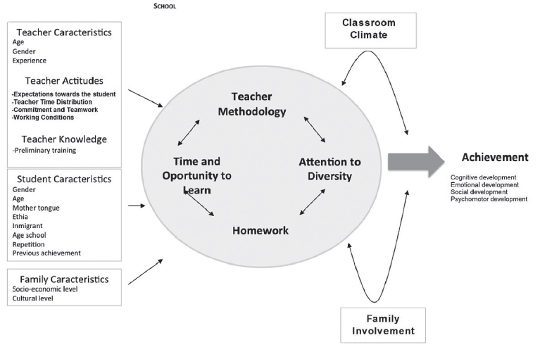 The second block of variables, include the actions of the teacher inside and outside the classroom. The factors of effective teaching occurring inside the classroom are: Teaching methodology (understood in a wide sense that also addresses the use of homework, and attention to the diversity of the students), and the Classroom atmosphere. The interaction of both factors directly influences how the Instruction time and Learning opportunities are distributed.