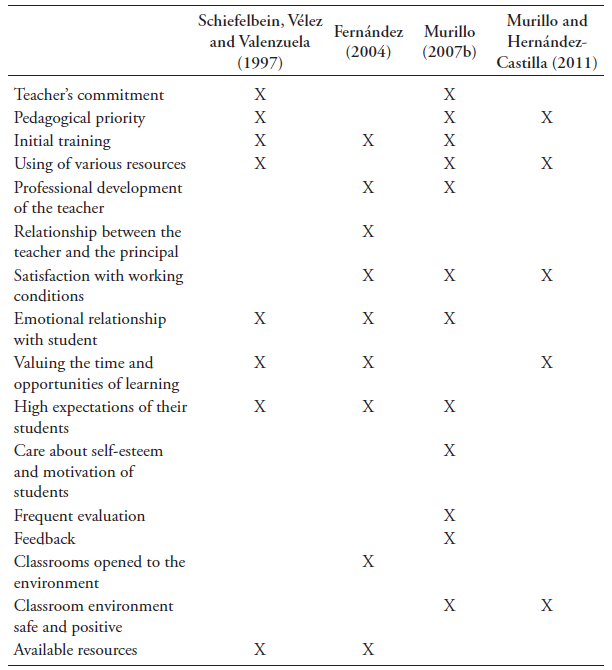 There are few studies on effective teaching in Ibero-America, so it is uncertain whether there are existing factors of effective teaching at this stage. Particularly noteworthy research has been conducted in Argentina, Chile and Perú; for example, Cervini (2002, 2003), Cueto (2003), Martinic and Pardo (2003). Some reviews about the research on school effectiveness developed during the last period of the stages detailed above, provided some useful information about what those features were for Ibero-American schools (Fernández, 2004; Murillo, 2007b; Schiefelbein, Vélez, & Valenzuela, 1997). Table 1 summarizes the findings of each study, and includes those, contributed by Murillo and Hernández-Castilla (2011) that was considered to be the first study addressing impact on the socio-emotional development of the students in Ibero-America.