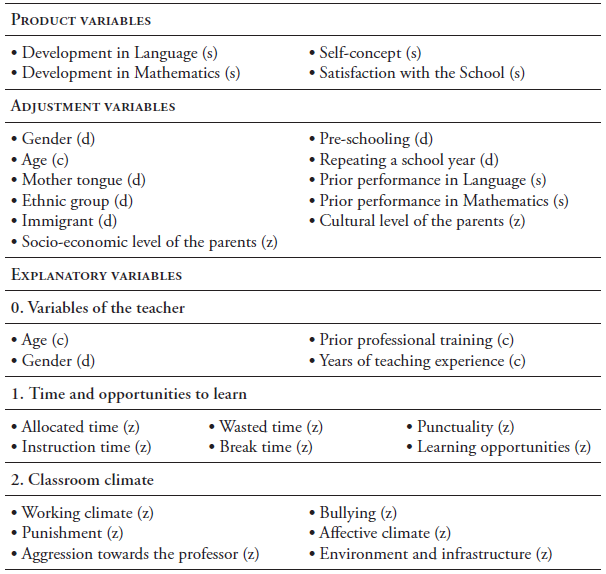 After a long process of sorting, configuration, and scaling, the large number of variables obtained by the ISER have been reduced to four product variables (two of cognitive development and two of socio-affective development), 11 adjustment variables, and 61 explanatory variables (Table 3).