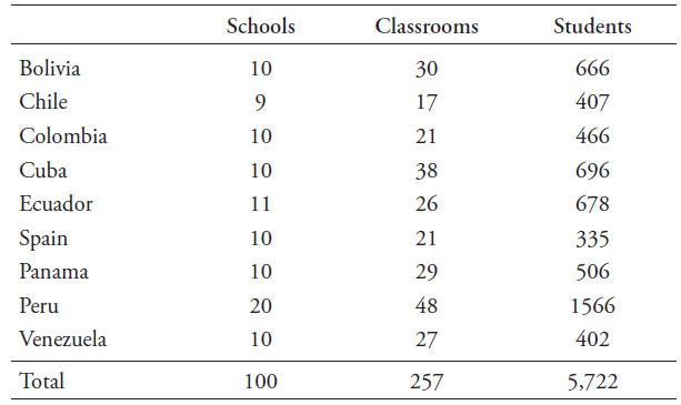 The sample consisted of 5,722 students from 257 classrooms from the third year of Primary School, attending 100 schools located in 9 countries of Ibero-America (Bolivia, Chile, Colombia, Cuba, Ecuador, Panama, Peru, Spain, and Venezuela) (Table 4). The sample was selected so that it would be possible to verify whether previous EER studies were generalizable, once the variables related to the classroom were taken into account. The approach was to select certain cases, in the way that: a) they fulfilled the methodological requirements of the research (for example, different cases from each level were organized hierarchically); b) they worked with maximum experimental variability (for most of the countries in the study, half of the schools could be considered below the average, when talking about effective teaching according to the opinion of the Inspectors); c) the schools were also representative of different kinds of neighborhoods in the country (they were chosen from different large and medium cities as well as villages from regions all over the country). The introduction of data coming from countries of South America, Central America, the Caribbean, and Europe, as well as the diversity of the social, economic and educational status of the nine countries involved, enabled the researchers to assert that the model elaborated from this sample, would closely approximate the reality of the Ibero-American community as a whole.