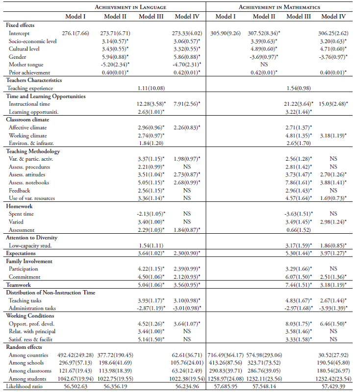 Teaching methodology. The six variables that made a significant contribution to Model III, both in Achievement in Language and in Mathematics, were the following: “Varied and participatory activities”, “assessment of procedures”, “assessment of attitudes”, “assessment of notebooks”, «feedback and use of different resources”. All of them made a positive contribution, but with no major differences in Language and Mathematics.