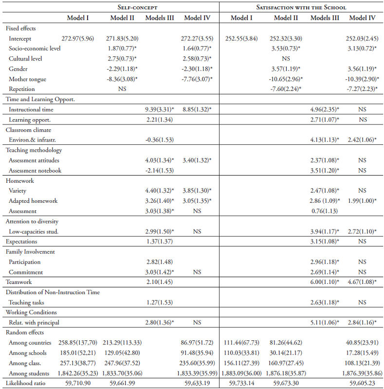 There were a small number of variables that made a statistically significant contribution to Models III and IV considering the two measures of socio-affective development (15 variables). This demonstrated the lower incidence that teaching had on the Self-concept of the student, and their Satisfaction with the School (Table 6).