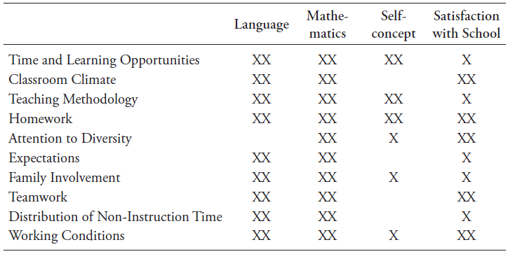 According to the calculations of this research, ten factors of effective teaching are associated with the development of students, either with their cognitive development (Achievement in Language and in Mathematics), or with their socio-affective development (Self-concept and Satisfaction with the School), and, in most cases, with both (Table 7).
