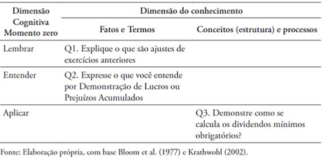 Este estudo explorou o uso da técnica de ensino de seminário, complementarmente à aula expositiva e resolução de exercícios, para verificar se o uso dessa técnica possuía capacidade de influenciar no nível de desenvolvimento cognitivo dos estudantes de Ciências Contábeis. Para responder a essa questão, foram realizadas três avaliações, baseadas na Taxonomia de Bloom, que utiliza categorias de análise que permitem acompanhar o desenvolvimento cognitivo alcançado, diante da dimensão do conhecimento proposto (fatos, conceitos, processos e meta-cognitivo) e da dimensão cognitiva (lembrar, entender, aplicar, analisar, avaliar e criar). Esta taxonomia permite avaliar a aprendizagem pretendida, analisando as dimensões do processo cognitivo e do conhecimento, representadas através de etapas hierárquicas, que permitem analisar o desenvolvimento das habilidades do pensamento de ordem inferior para o desenvolvimento da ordem superior (Krathwohl, 2002).