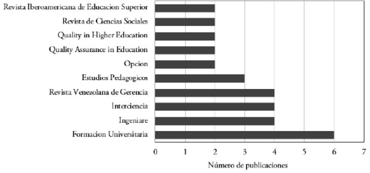 En total se publicaron 59 artículos, que pertenecen a 38 revistas, y que se concentran en diez fuentes (53%). Las cinco revistas más importantes según el número de publicaciones, todas de origen latinoamericano, son las siguientes: Formación Universitaria (6), Ingeniare (4), Interciencia (4), Revista Venezolana de Gerencia (4) y Estudios Pedagógicos (3). Véase la Figura 1.