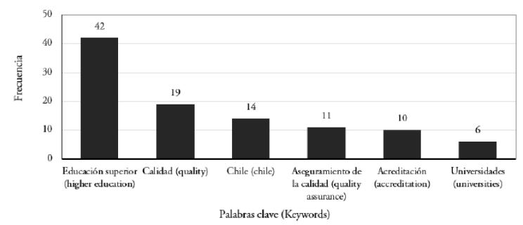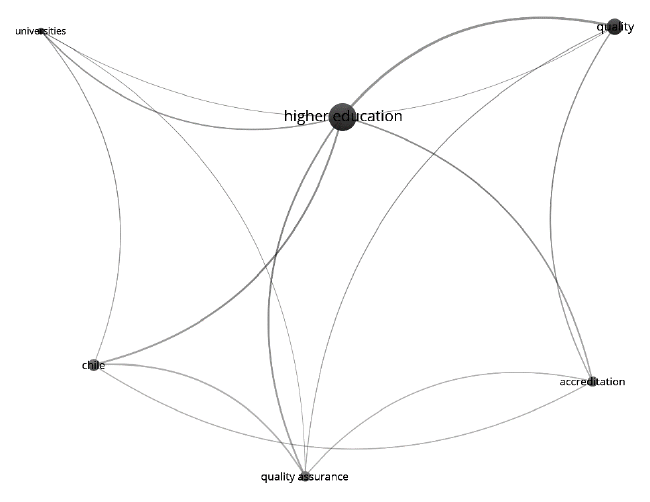 Los resultados del análisis de las palabras claves, sintetizados en la Figura 8, revelan que los conceptos más recurrentes son educación superior, calidad, Chile, acreditación, aseguramiento de la calidad y universidades, denotando así la similitud con lo revelado por otros estudios internacionales que destacan los mismos términos focales (educación superior y la calidad) (Brika et al., 2021).