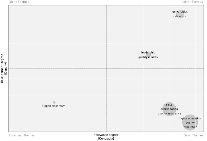 Por lo demás, los hallazgos de la investigación permitieron identificar un limitado grupo de temas básicos (acreditación, calidad y educación superior) y de temas motores (indicadores y universidades), que reflejan un grado de asociación sustancial entre los tópicos de estudio y una baja densidad productiva. También, otras temáticas como los modelos de calidad y los estilos de liderazgo mostraron una interconexión significativa (relevancia media) y un bajo nivel de desarrollo (densidad). Ello devela la existencia de un campo de estudio que todavía se encuentra en una etapa de crecimiento y que, por tanto, brinda la oportunidad de ser enriquecido con una mayor producción científica, con nuevas temáticas derivadas y complementarias.