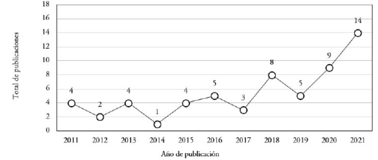 La producción científica sobre la calidad en la educación superior en Chile muestra una evolución positiva, que se traduce en una tasa de crecimiento anual de 13%, y un promedio de 5,4 publicaciones por año. Para el periodo de estudio (2011-2021) se encontraron 59 artículos, cuya máxima productividad es de origen reciente, pues más del 66% del total publicado se produjo durante los últimos cinco años. Ver Figura 2.