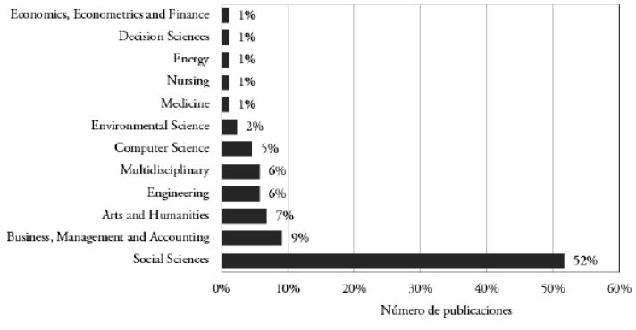 La Figura 3 muestra que la mayor proporción de las publicaciones (cerca del 70%) derivan de solo tres áreas de estudio: ciencias sociales (52%), negocios, administración y contabilidad (9%), y artes y humanidades (7%). Estos resultados, por un lado, evidencian el predominio de las ciencias sociales en el campo de estudio y, por otro, se encuentran en línea con lo develado por Steinhardt et al. (2017) en cuanto a la existencia de dos visiones de interés particular sobre la calidad de la educación superior (educación y gestión).