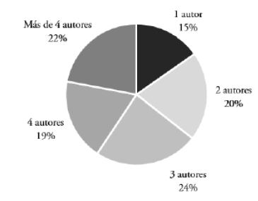 El total de artículos científicos sobre calidad de educación superior se elabora, mayormente, de forma colaborativa. Resaltan las producciones de tres autores (24%), seguidas de trabajos con más de cuatro autores (22%), dos autores (20%), y cuatro autores (19%). Solo el 15% de las publicaciones son elaboradas por un solo autor. Véase la Figura 4.