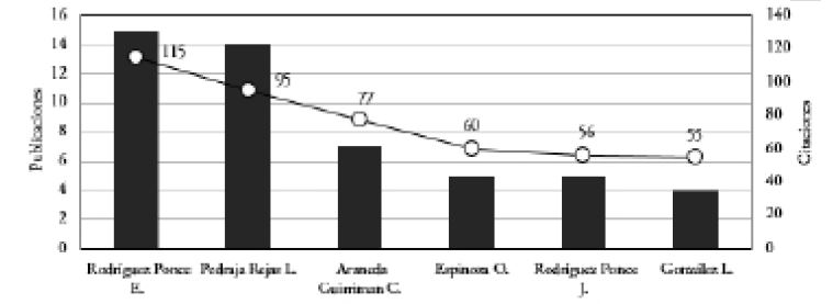Por lo demás, al analizar los investigadores de mayor producción, resaltan los autores Emilio Rodríguez-Ponce (15 publicaciones) y Liliana Pedraja-Rejas (14 publicaciones). Cabe destacar que ambos investigadores se encuentran afiliados a una misma institución de educación superior (Universidad de Tarapacá) y que la mayoría de sus trabajos son de colaboración mutua (12 publicaciones). También, Rodríguez-Ponce y Pedraja-Rejas son los autores más citados con 115 y 95 citas, respectivamente; muy por sobre los valores logrados por otros referentes. Ver Figura 5.