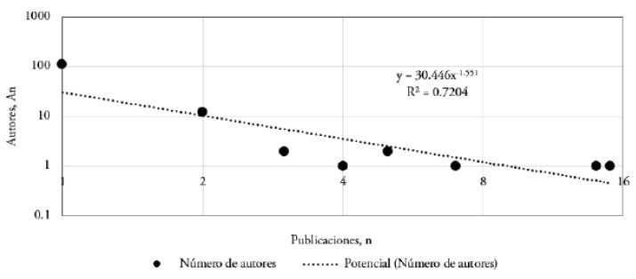 Los resultados anteriores permiten denotar la presencia de una distribución desigual y concentrada de la producción en términos de autoría, tal como lo advierte la aplicación de la Ley de Lotka. Esta ley bibliométrica establece que gran parte de las contribuciones científicas provienen de un número reducido de autores, lo que puede evidenciarse al observar la correlación positiva entre el menor número de autores y el mayor número de publicaciones efectuadas. La Figura 6, que ilustra esta premisa, confirma que el número de autores «An» que publican «n» trabajos sobre la calidad de la educación superior es inversamente proporcional al cuadrado de n (R² = 0,94).