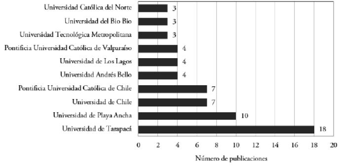 Al revisar las principales afiliaciones de autores que investigan sobre calidad en educación superior en Chile se observa la predominancia de la Universidad de Tarapacá (18), seguida por la Universidad de Playa Ancha (10), la Universidad de Chile (7) y la Pontificia Universidad Católica de Chile (7), lo que demuestra también la concentración existente de la literatura en cuanto a las instituciones de origen. Véase la Figura 7.