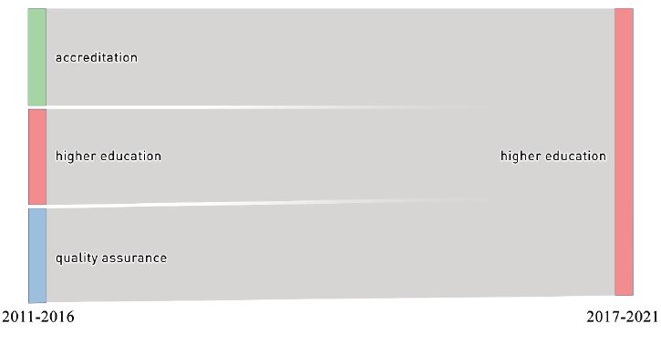 Por lo demás, al revisar la evolución temática de los tópicos de estudio se aprecia un cambio desde un enfoque inicial más dirigido a la acreditación y el aseguramiento de la calidad (periodo 2011-2016) a estudios recientes, más transversales, sobre educación superior (periodo 2017-2021). Ver Figura 9. Esto sugiere que la literatura actual sobre educación superior aborda una amplia variedad de temas, en adición a la acreditación y el aseguramiento de la calidad, que son elementos fundamentales y recurrentes en la literatura existente (Espinoza & González, 2013; Gallardo et al., 2011; Rodríguez-Ponce et al., 2011). Entre los temas recientes se incluyen la satisfacción discente y la calidad del servicio (Jiménez-Bucarey et al., 2021), el liderazgo y la cultura de la innovación (Pedraja-Rejas et al., 2018; Pedraja-Rejas et al., 2020) y las metodologías activas de aprendizaje (Hidalgo et al., 2021; Pérez-Sanagustín et al., 2021).