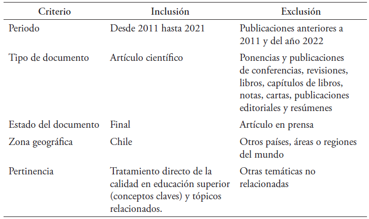 Para la búsqueda de la información se utilizaron los conceptos claves de estudio (calidad y educación superior) demarcados al área geográfica (Chile), periodo de análisis (2011-2021) y al tipo de documento relevante (artículos científicos). Concretamente el código booleano usado para la búsqueda de los términos relevantes («quality», «higher education», «higher education quality», «quality of higher education») se aplicó en los títulos (TITLE), palabras claves (KEY) y resúmenes (ABS) solo de artículos científicos (DOCTYPE) cuyo estado final fuera el de publicado (PUBSTAGE) y delimitados a los años (PUBYEAR) y el país de interés (AFFILCOUNTRY). Luego, la información de la base de datos resultante en Scopus (63 artículos) fue revisada y ajustada en cuanto la pertinencia de los artículos encontrados, hallándose un total de 59 estudios relevantes, en idiomas inglés y español.