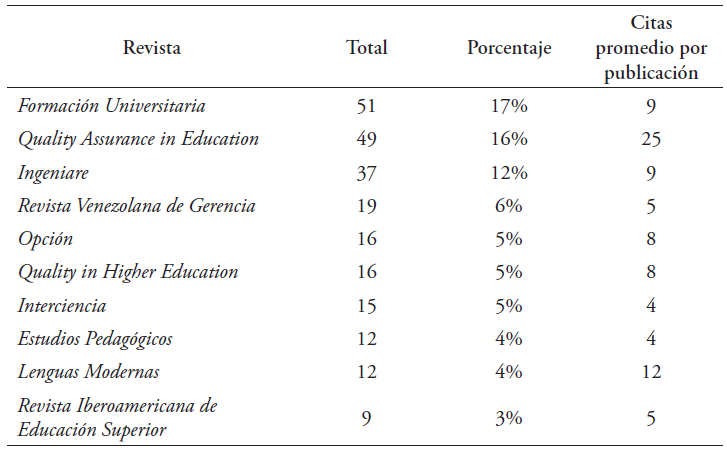 Por su parte, el 70% de las citas se concentran en ocho revistas. De ellas, las tres más relevantes son: Formación Universitaria, con 51 citas; Quality Assurance in Education, con 49 citas; e Ingeniare con 37 citas. Además, sobresale la revista Quality Assurance in Education con el mayor número de citaciones promedio por publicación (Véase la Tabla 2).