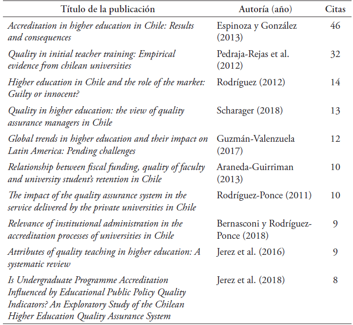 La Tabla 3 muestra las publicaciones con más citaciones para el periodo 2011-2021. En concreto, diez publicaciones agrupan 163 citas, es decir, el 17% de los artículos sobre la temática ha recibido el 53% del total de las citaciones (308 citas). El artículo más referido (46 citas) es Accreditation in higher education in Chile: Results and consequences de Espinoza y González (2013). El estudio analiza y discute las implicaciones, positivas y negativas, que el sistema de acreditación implementado en Chile ha tenido sobre las IES y los programas de pre y posgrado. En segundo lugar, se encuentra el artículo Quality in initial teacher training: Empirical evidence from Chilean universities (32) de Pedraja-Rejas et al. (2012), que mediante un modelo de regresión lineal confirma la influencia significativa de la calidad institucional de las universidades chilenas en la formación inicial docente. Por último, destaca la publicación Higher education in Chile and the role of the market: Guilty or innocent? (14) en la que Rodríguez (2012), luego de analizar las deficiencias del sistema de educación superior en Chile, sostiene que, aunque este presenta una cobertura creciente no visibiliza las problemáticas internas, como los altos niveles de deserción, la duración excesiva de programas, la falta de equidad en el acceso a la educación, entre otras.