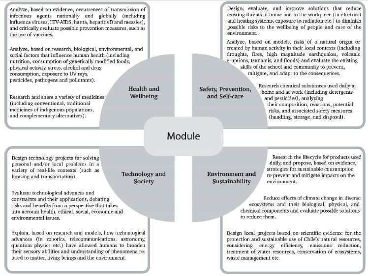 The subject of Science for Citizenship is composed of four modules. Their duration is one semester. In Figure 2, the modules and learning objectives are presented. In the relationship between the modules of the subject and the objectives of scientific literacy, we see the coherence of the proposed work plan with important themes for citizens. The proposal is to work on issues of a scientific nature that adequately address the context so that individuals value and utilize scientific knowledge to generate informed opinions and viable solutions. It raises working on problems related to health and wellbeing, such as consumption of genetically modified foods, pathogens, and contaminants. In addition, the proposal is to address safety, prevention, and self-care issues, such as medications, pesticides, exposure to radiation, earthquakes, and tsunamis, among others. In the environment and sustainability module, the focus is working on issues of consumption, energy efficiency, and resource management, among others. Finally, the technology and society module proposes designing technology projects and address issues related to robotics, telecommunications, and astronomy, among others.
