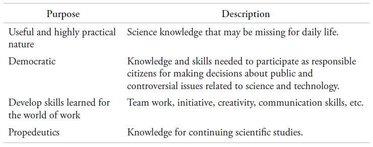 The end goal of teaching or education in the science has been changing throughout time. This has been reflected in that education has been extended to different levels of the population, changing the way future scientists are trained to what is promoted today. The goal is to educate the population about scientific issues so that all citizens are aware of the different problems in the world and how they can act on them (Martín, 2002). Acevedo (2017) maintains that the end goal of teaching the science is related to its useful and practical nature related to training citizens to develop abilities for the work world and to continue scientific studies (See Table 1).