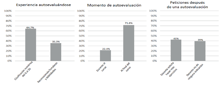 Con respecto al momento e intención al autoevaluarse, el 71.6% de los estudiantes reportaron que lo hacían al finalizar un curso, con aparente intención sumativa, y solo un 22.4% indicó que lo hacían a lo largo del proceso de aprendizaje, con intención formativa. Además, se indagó en lo que generalmente el docente ha solicitado luego de aplicar la autoevaluación. Con porcentajes muy parecidos, los estudiantes respondieron que el docente les solicita realizar más ejercicios (41%) y que no han recibido ninguna indicación de parte de los docentes luego de la autoevaluación (39%).