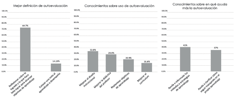 La segunda categoría exploró el conocimiento previo que los estudiantes tenían sobre la autoevaluación del aprendizaje (Ver Figura 2). Es así que, la gran mayoría de estudiantes (64.7%) manifestó que la mejor definición de autoevaluación era el reflexionar sobre lo que ha logrado y lo que le hace falta lograr para alcanzar objetivos de aprendizaje, mientras que un 14.9% respondió que la mejor definición de autoevaluación era colocar una nota al aprendizaje o desempeño. Así mismo, los estudiantes expresaron sus conocimientos sobre el uso de la autoevaluación, donde las opiniones estuvieron distribuidas casi equitativamente. Un 32.8% indicó que el uso más importante de la autoevaluación es para mejorar el diseño instruccional; un 29.9% pensó que es para mejorar la didáctica del profesor; mientras que un 20.9% opinó que es para replantear los objetivos de aprendizaje, y un 16.4% manifestó que es para mejorar el currículum.