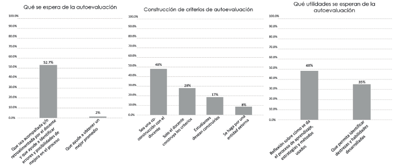 Sobre el establecimiento de los criterios de la autoevaluación (Ver Figura 3), un 48% de los estudiantes esperan que sea una co-construcción con el docente; a diferencia de un 28% que espera que solo el docente construya los criterios. Un 17% expresó más bien, el deseo de construir ellos mismos los criterios, y un 8% transfiere esa responsabilidad a una entidad externa. También se reportó que los estudiantes esperan que los resultados de su autoevaluación tengan relación con lo que opinan de ellos mismos (54.2%), con la calificación que el docente les otorgó (39.3%) y con lo que sus compañeros opinaban de ellos (6.5%).